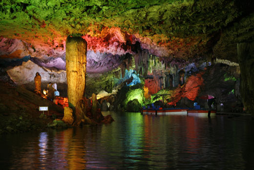 伴隨著小型瀑布的落水聲,步入洞內(nèi),光線迅速變暗。等瞳孔適應(yīng)了洞內(nèi)的亮度后,眾人的注意力隨即被周身的自然奇觀奪走,親身體驗(yàn)到“別有洞天”的真意。大家或乘船觀光,或乘小火車游覽,或步行,闖過(guò)九關(guān)正陽(yáng)關(guān)、龍門關(guān)、山門關(guān)、喉門關(guān)、旋門關(guān)、金山關(guān)、重門關(guān)、金剛關(guān)、朝陽(yáng)關(guān)。游完全程5180米,花去約兩小時(shí),雖然饑腸蠕蠕,卻拋之腦后。