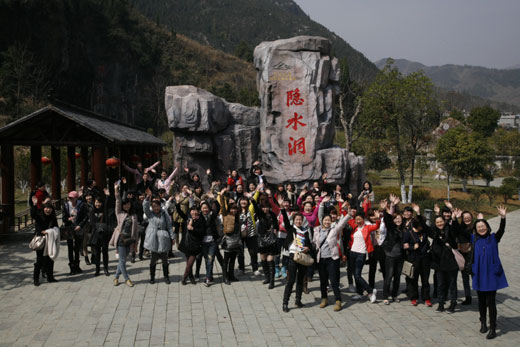 緊接著是拜訪咸寧福星城。營(yíng)銷中心大門外再次拉出現(xiàn)了“巾幗靚秀”字樣的橫幅,項(xiàng)目部的同胞們?cè)缫压Ш蛟诖?。大家?jiǎn)短地參觀了營(yíng)銷中心,并在門口合影留念,隨即啟程前往隱水洞。