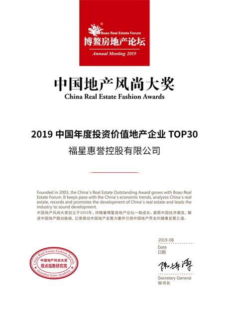 8月7日于海南舉行的“2019博鰲房地產(chǎn)論壇”現(xiàn)場,觀點指數(shù)研究院重磅發(fā)布了“2019中國地產(chǎn)風尚大獎”,福星惠譽控股有限公司憑借在過去一年的努力和業(yè)績,入選“2019中國地產(chǎn)風尚大獎”2019中國年度投資價值地產(chǎn)企業(yè)TOP30。